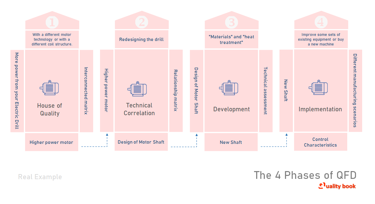 The four phases of QFD (Quality Function Deployment) guide the entire cycle from product design to production, these four phases are: 1. House of Quality, 2. Technical Correlation, 3. Development, 4. Implementation. through which it is used to translate customer requirements into specific design and engineering characteristics.
